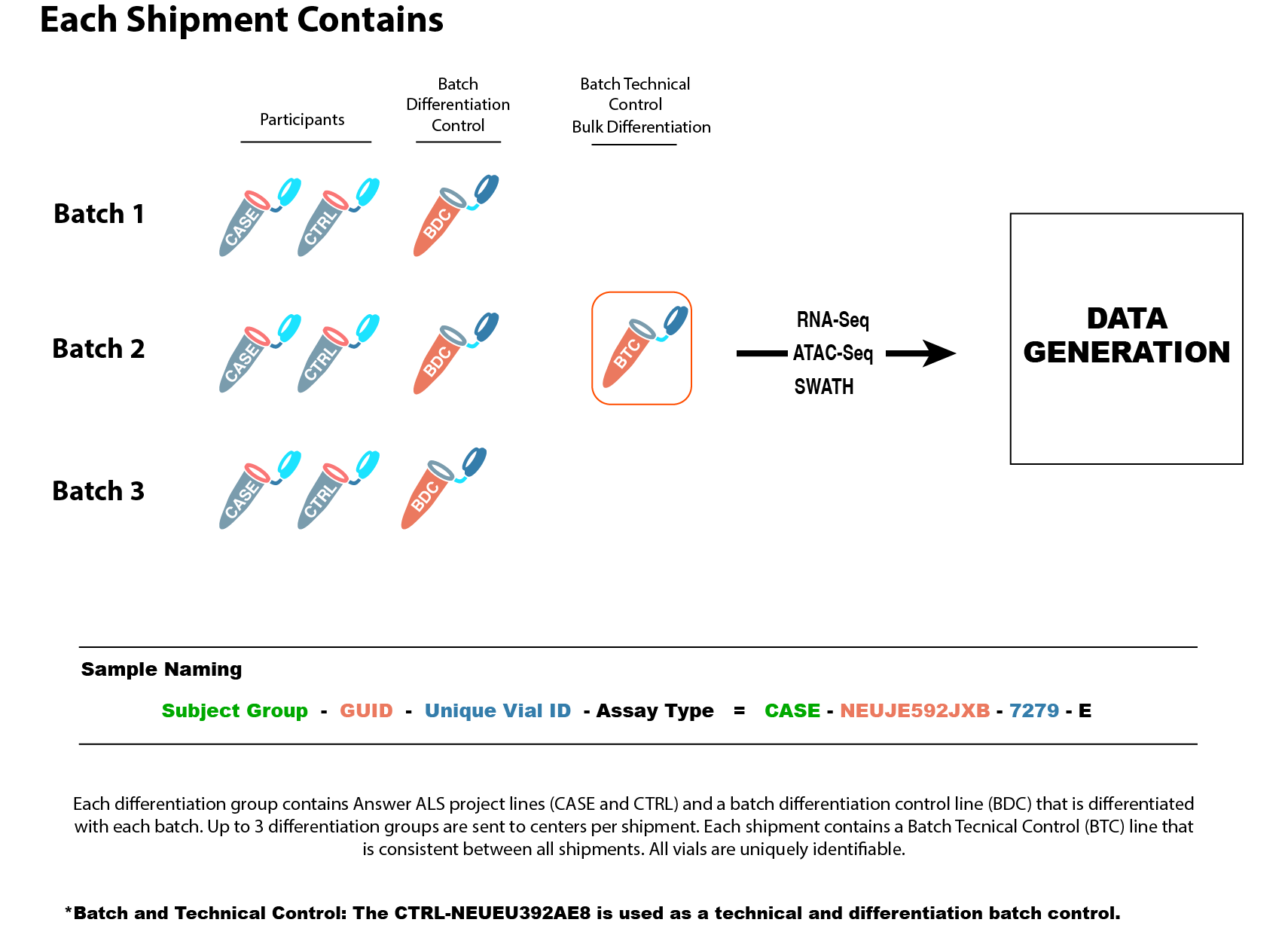 - Batch differentiation control (BDC): 2AE8iCTR-n6 line is also differentiated with every group of differentiations. This controls for inter-batch variability in differentiation. This line is thawed, expanded, differentiated, and pelleted in addition to the ALS/CTR lines in each batch. OMICs labs receive BDC pellets and ALS/CTR pellets for each differentiation batch.